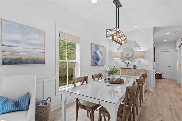 Dining area with seating for up to eight guests, there is also a kitchen counter with seating up to four guests