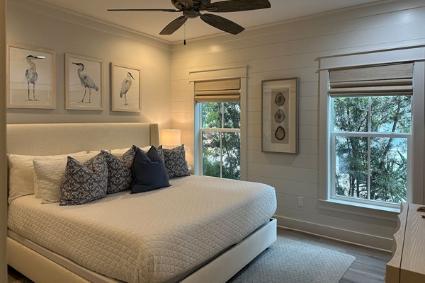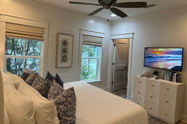 The spacious main-level king bedroom suite features a dedicated workspace in the closet, which includes an extra-large monitor, mouse, and keyboard for your use. You can close the door, and there is a small window for natural light.