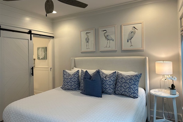 A stylish half bath off the entryway, conveniently located between the first-floor king suite and kitchen. Features a modern barn door, coastal accents, and easy access for guests.